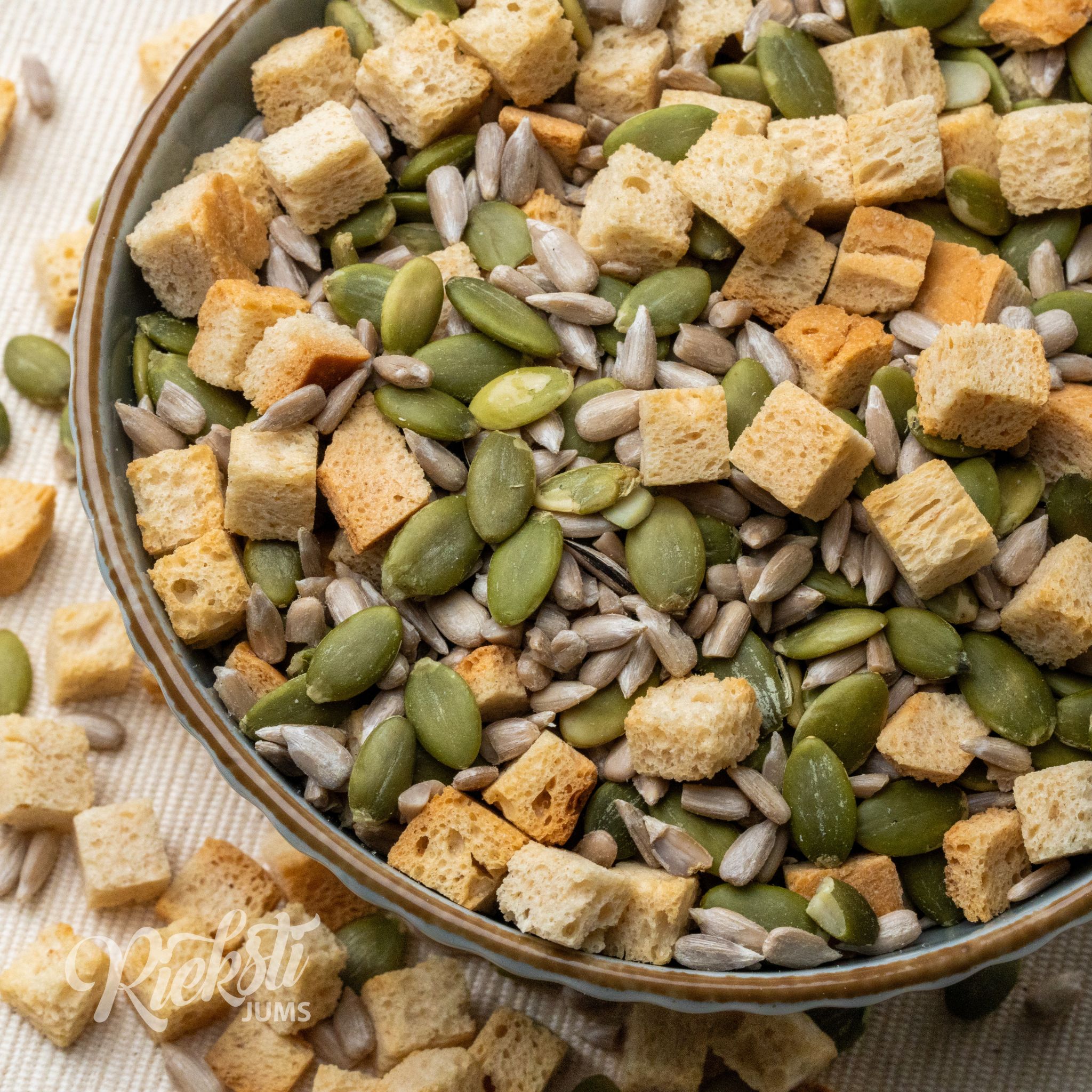 Piešķiriet saviem ēdieniem vairāk garšas, tekstūras un sātīguma ar šo universālo maisījumu salātiem un zupām. Kraukšķīgās sēklas un gardie grauzdiņi lieliski sader gan ar viegliem dārzeņu salātiem, gan ar biezām krēmzupām. Pārkaisiet ar to ķirbju, tomātu vai brokoļu zupu – acumirklī radīsies patīkams kraukšķīgums. Iemaisiet svaigos salātos ar fetas sieru vai ceptu vistu, izmantojiet kā piedevu sautējumiem vai pat uzkodu bļodām. Tā ir praktiska izvēle ikdienas gatavošanai, kad vēlaties ātri un vienkārši bagātināt ēdienu bez papildu sagatavošanas. Viena karote – un jūsu šķīvī jau vairāk garšas, kraukšķīguma un vizuālās pievilcības.
