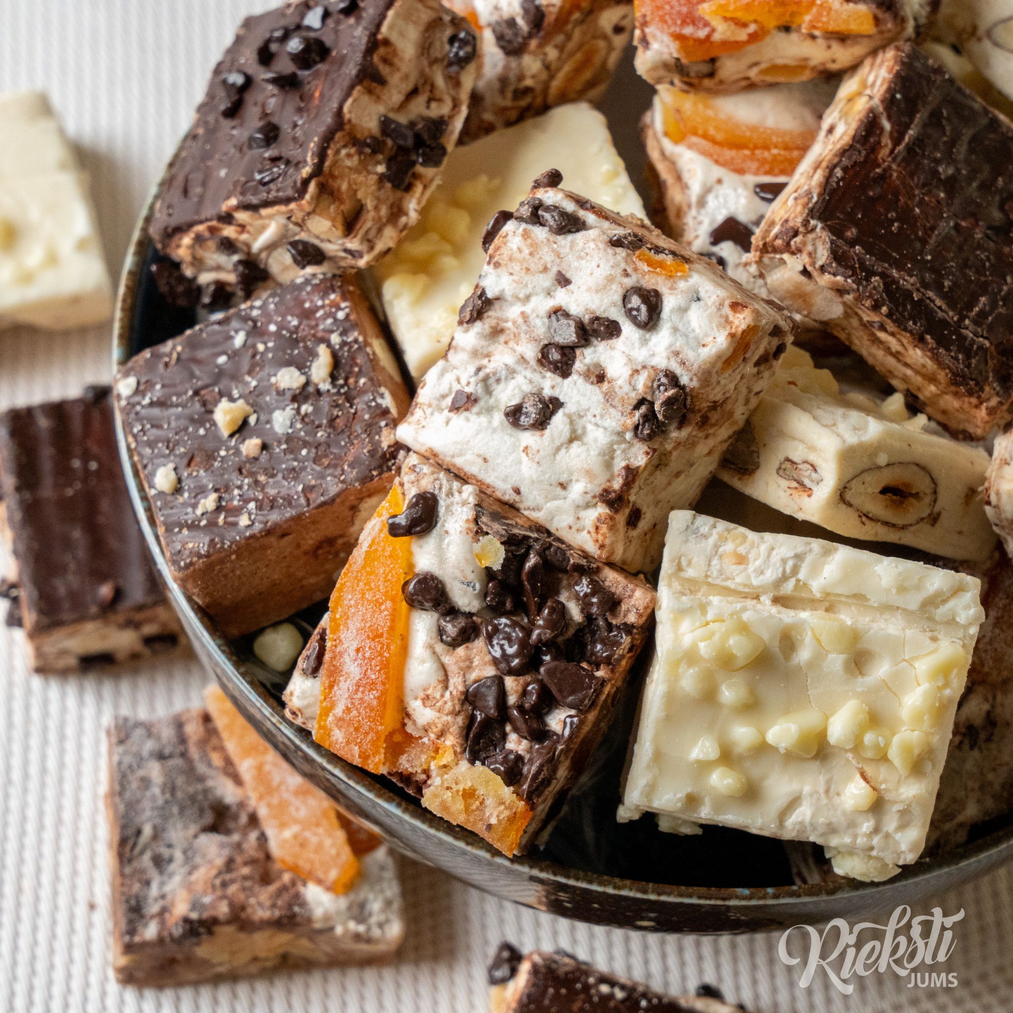 Atklājiet greznu saldumu izlasi vienā iepakojumā – mīkstās nugas konfekšu asorti ar dažādām garšām. Tā ir lieliska izvēle tiem, kuri novērtē kvalitatīvus desertus ar riekstiem, šokolādi un augļu gabaliņiem. Komplektā atradīsiet dažādu veidu nugu: ar tumšo un balto šokolādi, lazdu riekstiem, mandelēm, sukādētām apelsīnu mizām, rozīnēm un ogām. Katrs gabaliņš ir iepakots atsevišķi, tāpēc konfektes saglabā svaigumu un ir ērti pasniedzamas. Mīkstā un maigā nugas tekstūra lieliski sader ar kraukšķīgiem riekstiem un bagātīgu šokolādes kārtu. Tās ir lieliskas konfektes dāvanai, svētku galdam, birojam vai omulīgām kopā būšanas reizēm ar ģimeni. Meklējat mīksto nugu ar šokolādi un riekstiem? Šis komplekts ļaus baudīt garšu daudzveidību vienā iepakojumā.